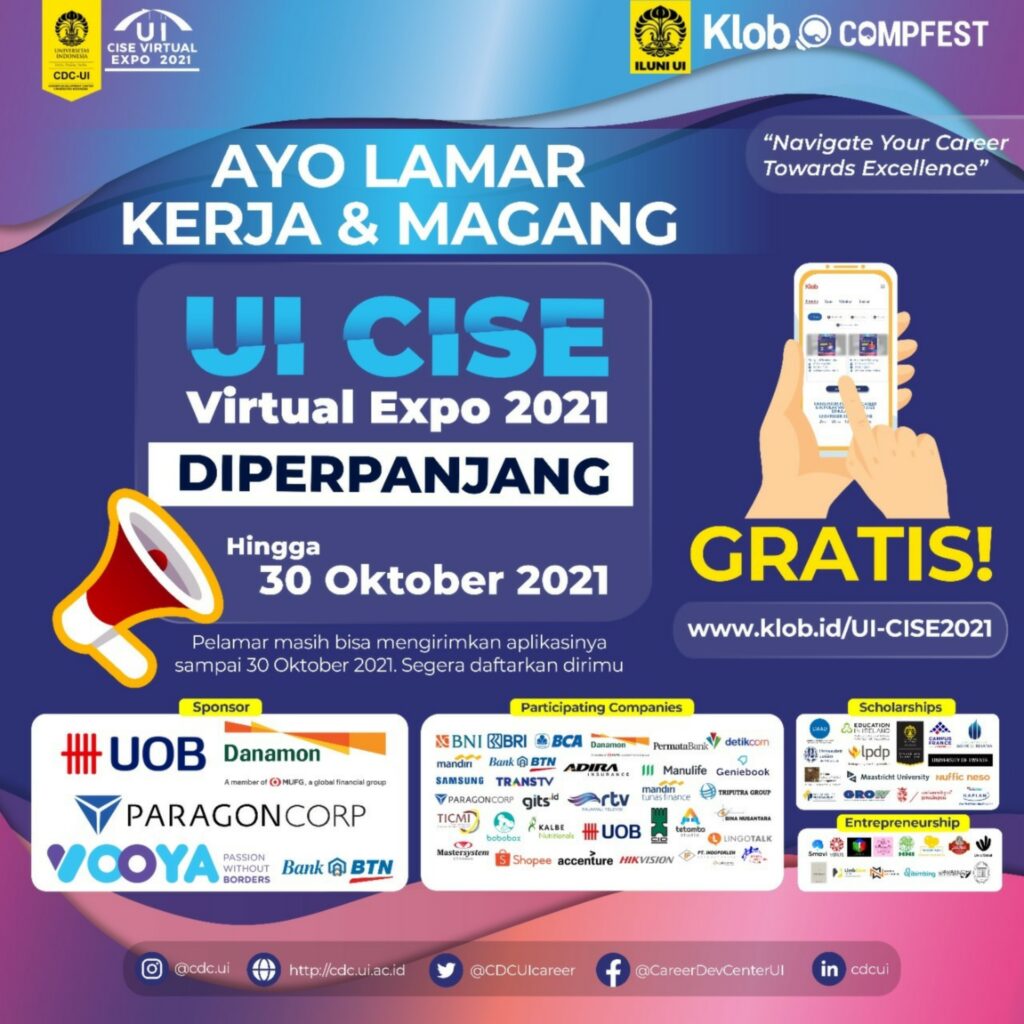 UI CISE Virtual Expo 2021 diselenggarakan untuk memfasilitasi lulusan dalam bekerja, melanjutkan pendidikan, dan mengembangkan usaha. Terdapat 4 rangkaian kegiatan dalam UI CISE Virtual Expo 2021 yang dapat kamu ikuti, yaitu pameran karier (career expo), pameran magang (internship expo), pameran beasiswa (scholarship expo), dan pameran kewirausahaan (entrepreneurship expo). Acara ini dibagi menjadi dua tahap yakni pra-acara dan acara, dengan rincian sebagai berikut: