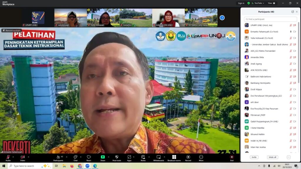 JEMBER – Lembaga Penjaminan Mutu dan Pengembangan Pembelajaran (LPMPP) Universitas Jember (UNEJ) sukses menyelenggarakan Pelatihan Peningkatan Keterampilan Dasar Teknik Instruksional (PEKERTI) Angkatan LXXXIII Tahun 2025 dengan format Hibrida, yang berlangsung secara lancar dan kondusif mulai 27 hingga 31 Oktober 2025. Pelatihan yang menggabungkan sesi hybrid via ZOOM dan tatap muka di Aula LPMPP UNEJ ini […]