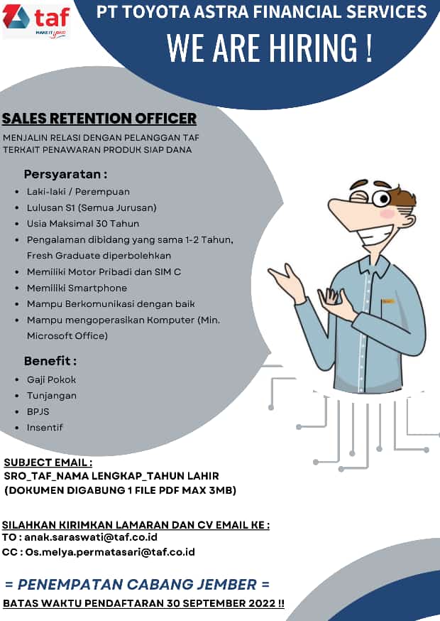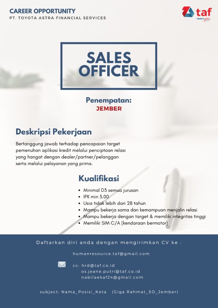 PT. Toyota Astra Financial Service membuka kesempatan bergabung sebagai “Sales Officer” Penempatan di Jember.