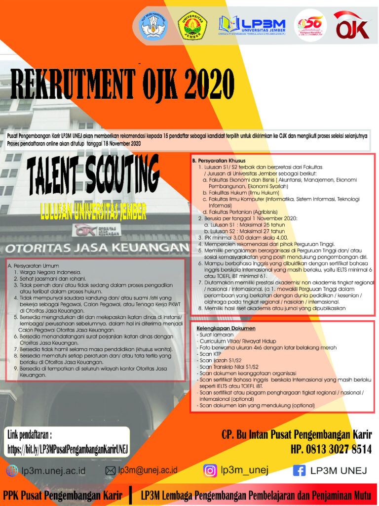 Otoritas Jasa Keuangan (OJK) bekerjasama dengan Universitas Jember (Pusat Pengembangan Karir, LP3M) memberikan kesempatan bagi alumni terbaik Universitas Jember untuk berkarir di OJK sebagai Calon Staff (PCS 5) melalui program Talent Scouting. Pusat Pengembangan Karir, LP3M UNEJ akan memberikan rekomendasi kepada 15 pendaftar sebagai kandidat terpilih, untuk dikirimkan ke OJK, dan mengikuti proses seleksi selanjutnya.