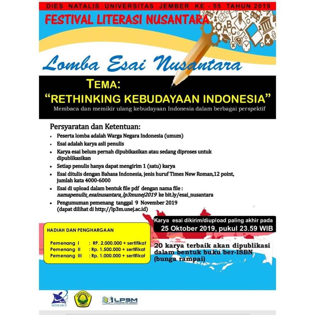 Dalam rangkaian Kegiatan Festival Literasi Nusantara, LP3M Universitas Jember mengadakan Lomba Esai Mahasiswa dengan tema “Dari UNEJ untuk Indonesia”. Lomba ini dapat diikuti oleh Mahasiswa Universitas Jember. Karya Esai dikirim/diupload dalam bentuk file pdf dengan nama file : namapenulis_esaiunej_lp3munej2109 melalui laman bit.ly/esai_UNEJ paling akhir pada tanggal 25 Oktober 2019. Persyaratan dan ketentuan lengkap dapat dilihat
