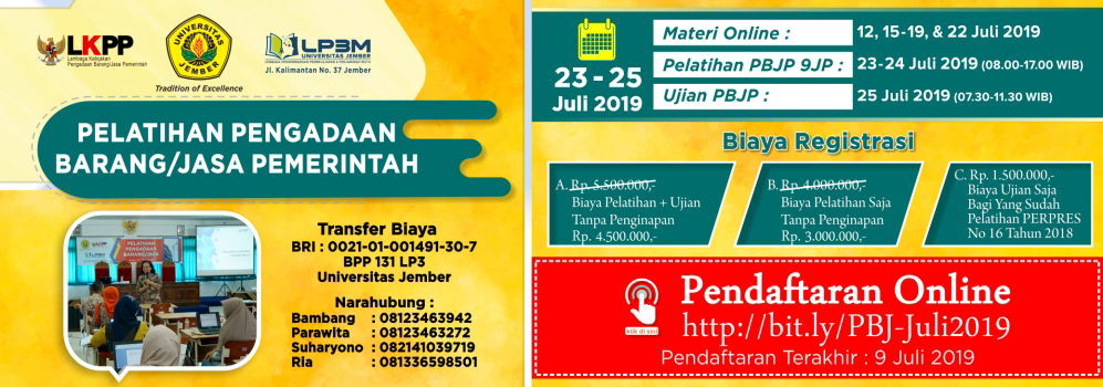 LP3M Universitas Jember menyelenggarakan Pelatihan PEKERTI Tahap I Tahun 2019 yang dijadwalkan berlangsung mulai tanggal 6 hingga 9 Agustus 2019. Pelatihan ini diikuti oleh 34 Dosen, 30 Dosen dari internal Universitas Jember dan 4 Dosen dari luar Universitas Jember yaitu dari STIE Widya Gama Lumajang, UNTAG Banyuwangi, IAID Blok Agung Banyuwangi, dan IKIP Jember.