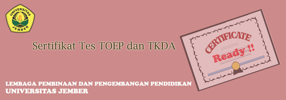 Diinformasikan kepada peserta dosen Universitas Jember yang mengikuti tes TOEP dan TKDA periode Serdos NIDN Juni – Juli 2015 yang dilaksanakan di Gedung CBT Fakultas Kedokteran Universitas Jember pada tanggal 26 s/d 28 Juni 2015, sertifikat hasil tes TOEP dan TKDA sudah bisa diambil di :