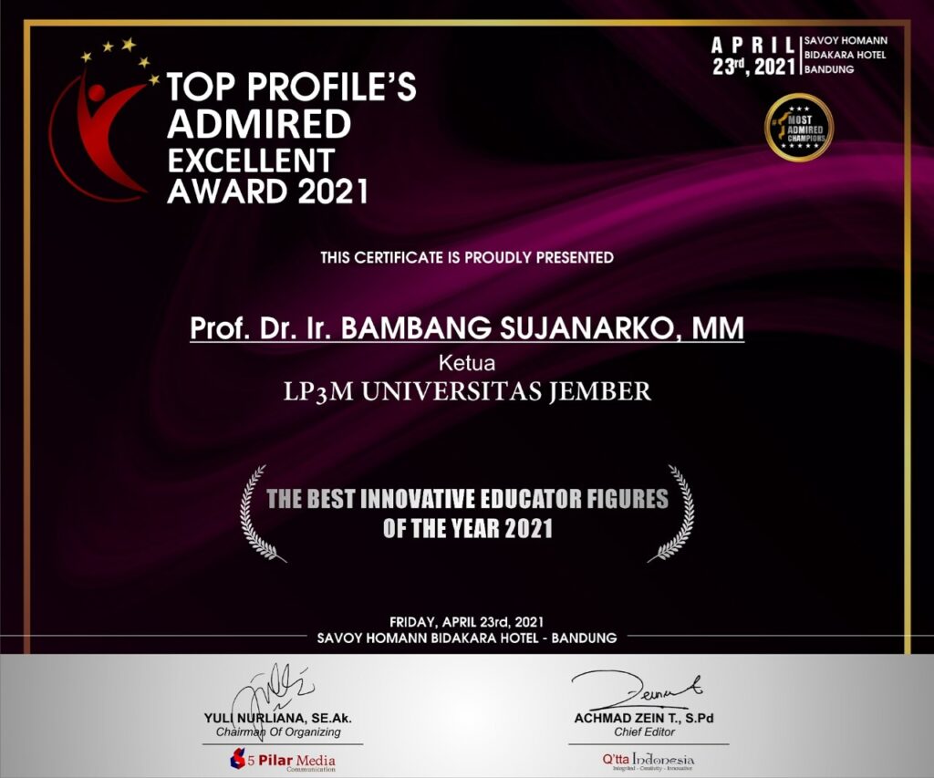 Ketua LP3M Kembali Memperoleh AWARD / Kegiatan dan Informasi 2021 / By lpmpp-unej Selamat Kepada Prof. Dr. Ir. Bambang Sujanarko, MM selaku Ketua LP3M Universitas Jember atas Penghargaan yang telah diperoleh sebagai The Best Innovative Educator Figures of The Year 2021.