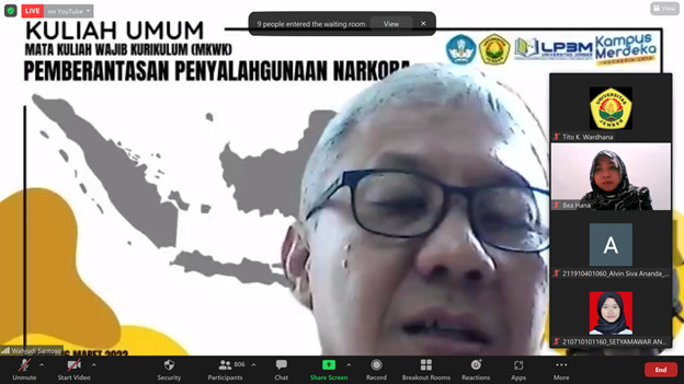Kuliah Umum MKWK Pemberantasan Penyalahgunaan Narkoba diakhir dengan diskusi dan tanya jawab antara peserta dengan narasumber. Kuliah umum MKWK sendiri dihadiri oleh lebih dari 1000 mahasiswa dan disirkan secara live melalu channel youtube. [BAK]