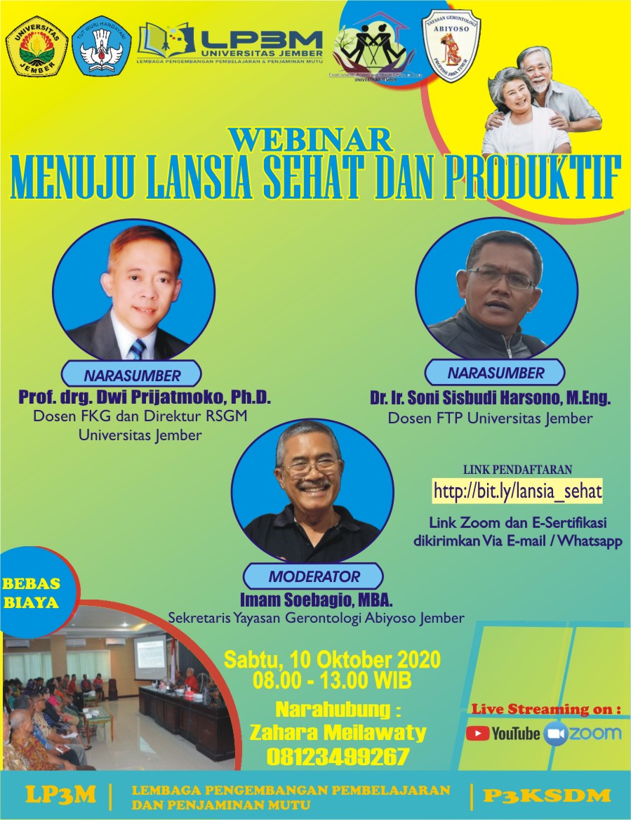 Kegiatan ini dilakukan sebagai bentuk kontribusi Universitas Jember bagi sivitas akademik Universitas Jember dan masyarakat umum. Kegiatan ini diharapkan dapat memberikan pengetahuan tentang bagaimana cara lansia agar tetap sehat dan mampu produktif dimasa senja dan dimasa pandemi COVID-19 ini. Tujuan yang akan dicapai dalam kegiatan ini yaitu memberdayakan lansia, khususnya untuk meningkatkan pengetahuan lansia tentang bagaimana lansia agar tetap sehat dan mampu produktif dimasa senja dan dimasa pandemi COVID-19 ini.