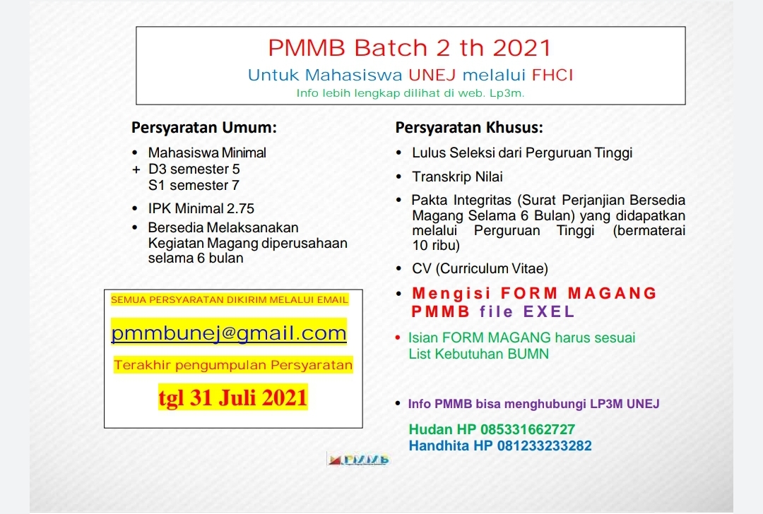 PMMB Batch 2 th 2021 / Kegiatan dan Informasi 2021, Magang / By lpmpp-unej Untuk informasi lebih lengkap dapat dilihat pada link di bawah ini : 1. CONTOHPAKTAINTEGRITAS 2. FORMAT_MAHASISWA_PMMB 3. JUMLAHKEBUTUHANBATCH-II