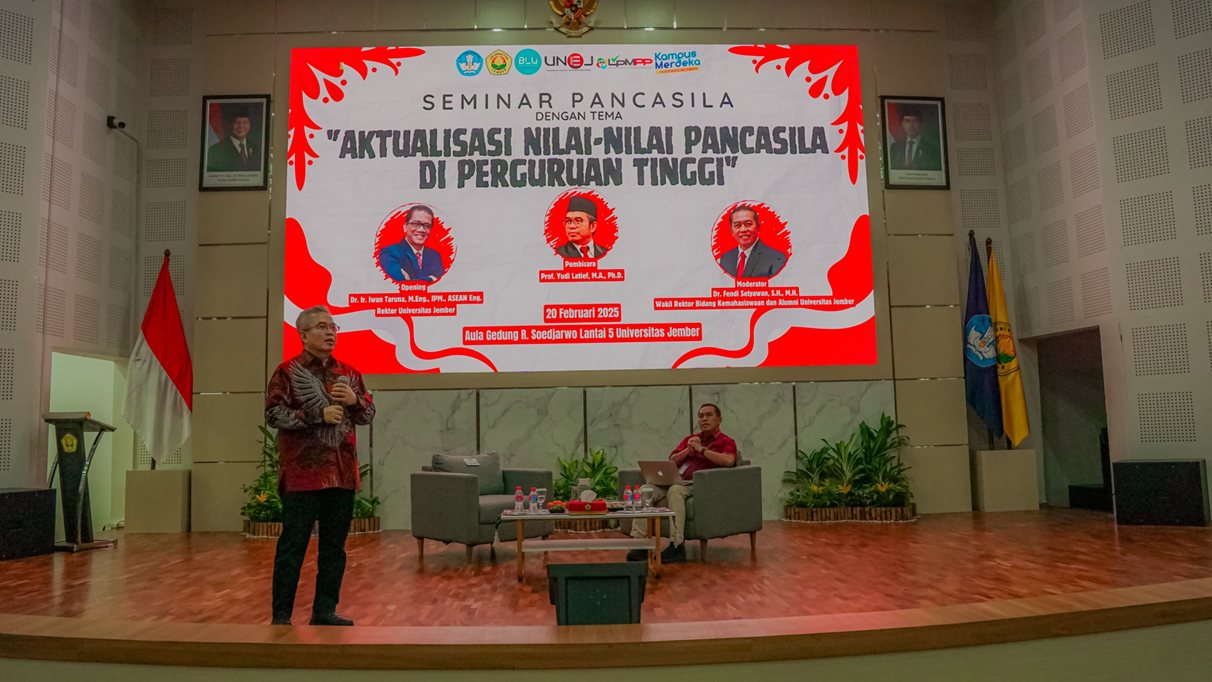 Jember – Universitas Jember menggelar seminar bertajuk Aktualisasi Nilai-Nilai Pancasila di Perguruan Tinggi pada Kamis, 20 Februari 2025, bertempat di Gedung Soejarwo. Acara yang berlangsung dari pukul 08.00 hingga 12.00 WIB ini menghadirkan narasumber utama Prof. Yudi Latief, M.A., Ph.D., serta dihadiri oleh pimpinan dekanat dan dosen Mata Kuliah Wajib Kurikulum (MKWK). Seminar ini bertujuan sebagai bentuk penyegaran bagi para pengajar MKWK dalam memberikan pembelajaran yang tepat dalam menanamkan nilai-nilai Pancasila kepada mahasiswa.