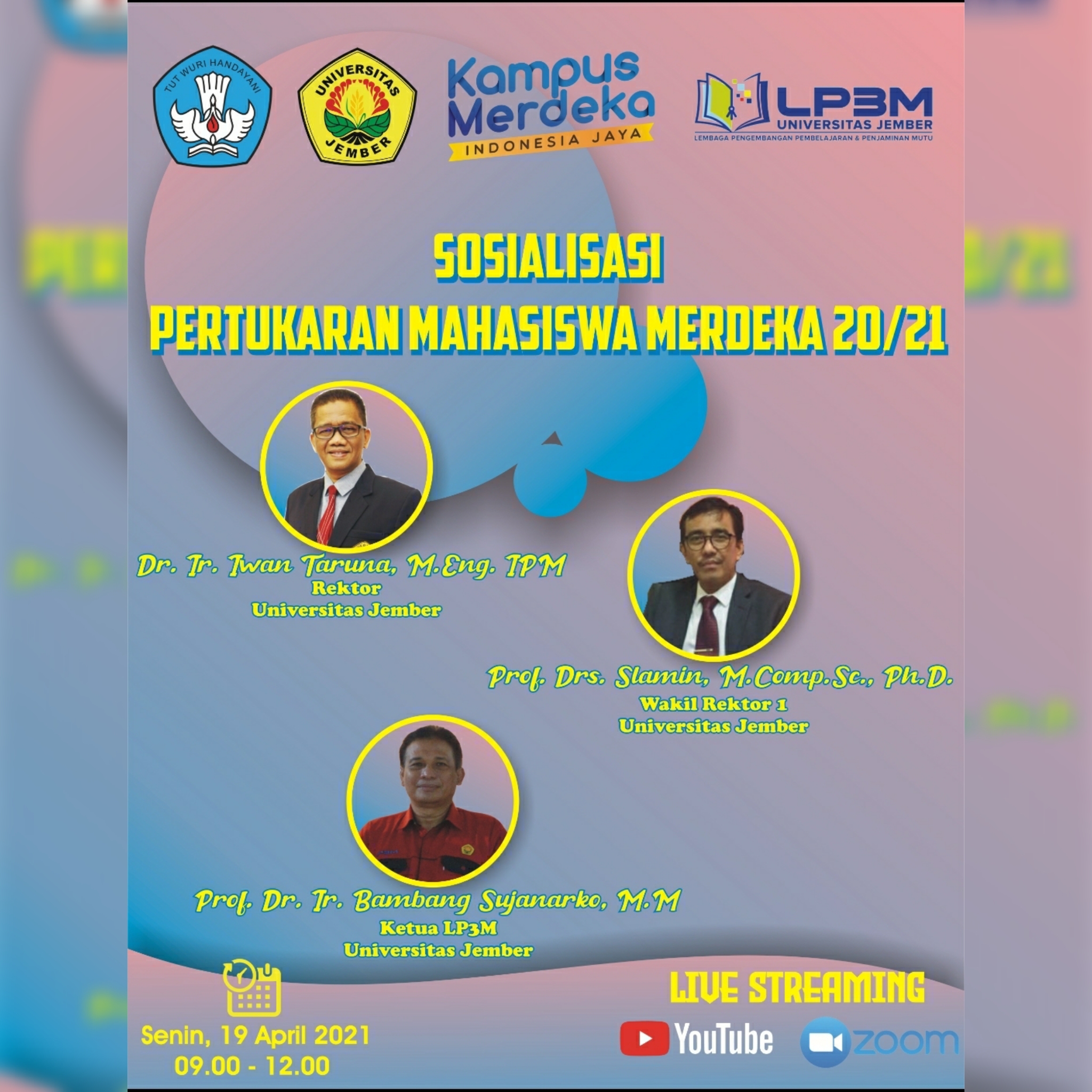 Sosialisasi Program Pertukaran Mahasiswa Merdeka dilaksanakannoleh LP3M Universitas Jember pada 19 April 2021 jam 09.00 melalui zoom, Sosialisasi ini di ikuti oleh Pimpinan di lingkungan Universitas Jember. Program Pertukaran Mahasiswa Merdeka akan dilaksanakan pada semester ganjil tahun akademik 2021/2022. Program ini memungkinkan terjadinya pertukaran mahasiswa antar pulau baik dari PTN ke PTS maupun sebaliknya.