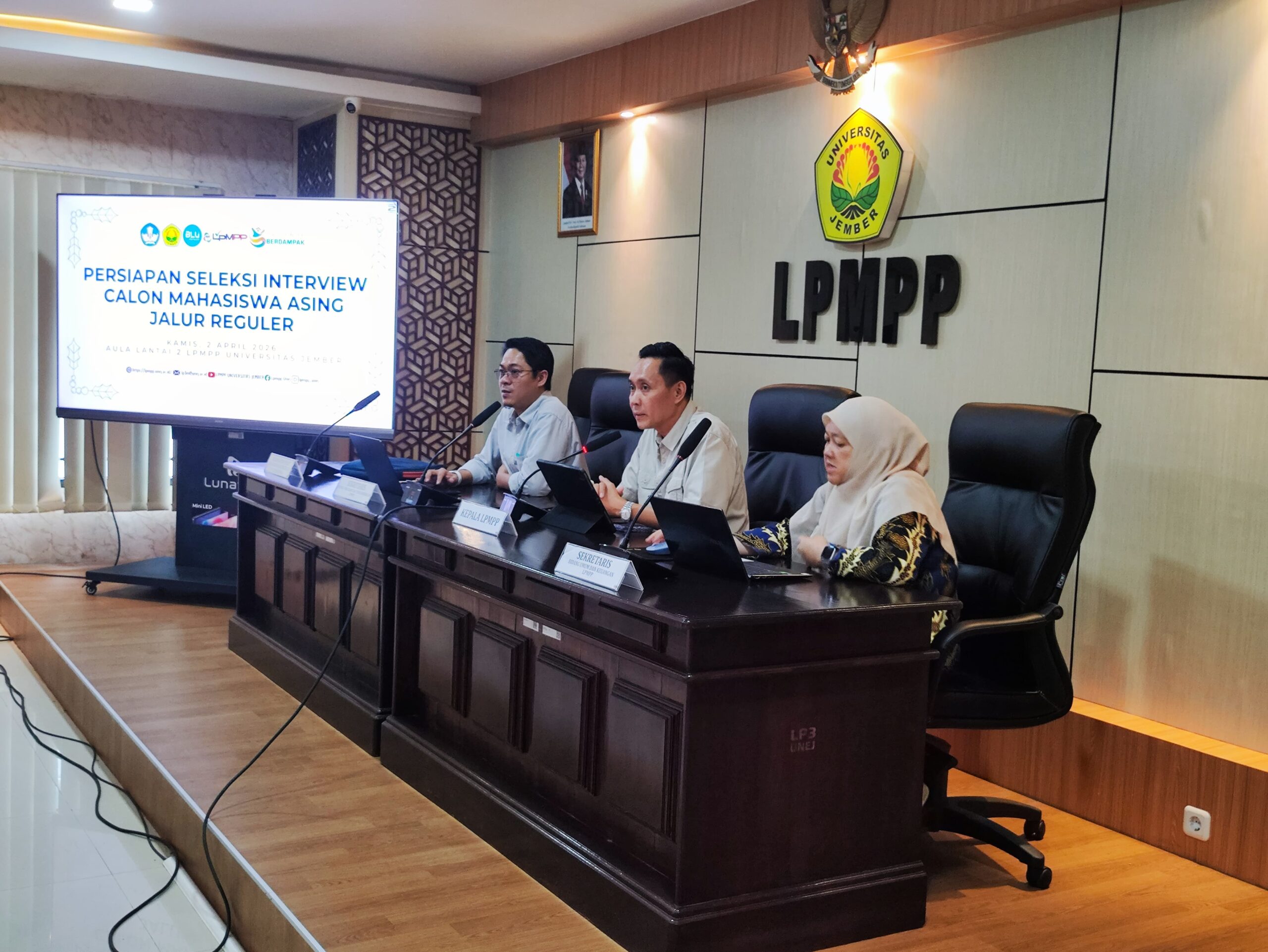 Kegiatan koordinasi persiapan seleksi interview ini dilaksanakan pada Kamis, 2 April 2026, bertempat di Aula Lantai 2 LPMPP Universitas Jember yang dibuka dengan sambutan dari Kepala LPMPP, Prof. Dr. Ermanto Fahamsyah, S.H., M.H., yang didampingi oleh Sekretaris bidang Program dan Pengembangan, Prof. Dr. Iis Nur Asyiah, S.P., M.P. Koordinasi ini dihadiri oleh pimpinan LPMPP, Wakil Dekan Bidang Akademik dari berbagai fakultas, Wakil Direktur Pascasarjana, Koordinator Program Studi yang terkait, serta anggota Pusat Layanan dan Kemitraan Internasional . Pertemuan tersebut bertujuan untuk menyamakan persepsi mekanisme pelaksanaan interview agar proses seleksi berjalan secara objektif, transparan, dan berkualitas.