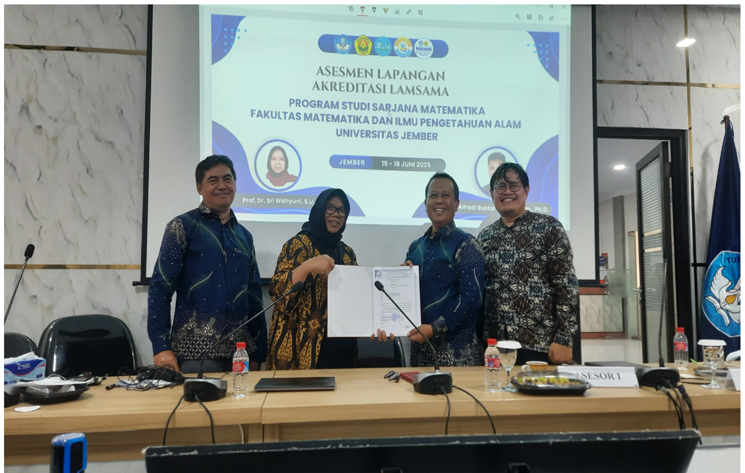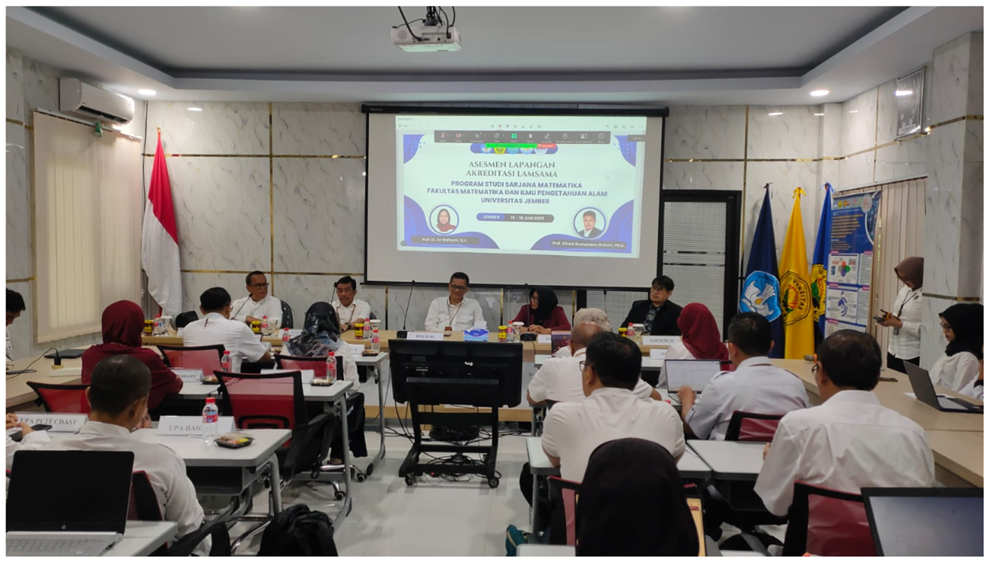 Jember, [18 Juni 2025] – Program Studi S1 Matematika FMIPA Universitas Jember baru saja melaksanakan kegiatan Asesmen Lapangan dalam rangka akreditasi program studi. Kegiatan ini berlangsung selama 2 hari (15-18 Juni 2025) dan melibatkan dua asesor dari Lembaga Akreditasi Mandiri Sains Alam dan Ilmu Formal (LAMSAMA) yaitu Prof. Dr. Sri Wahyuni, S.U (Universitas Gadjah Mada) dan Prof. Alhadi Bustamam, M.Kom, Ph.D (Universitas Indonesia)