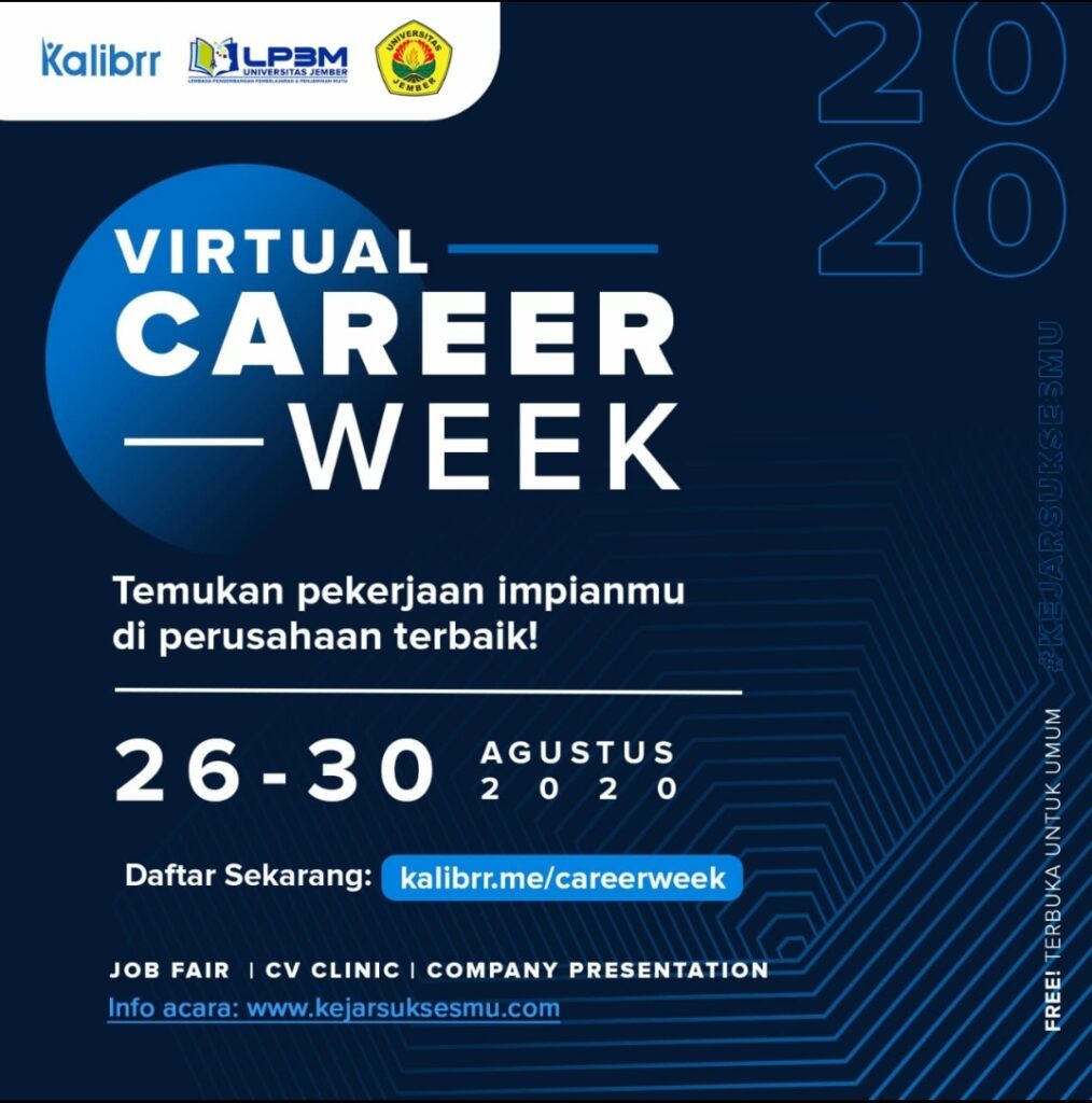 Virtual Career Week / Info Lowongan Kerja, Kegiatan 2020 / By lpmpp-unej Lp3M Universitas Jember memiliki kabar bahagia yaitu Mulai hari ini 26 Agustus 2020 sd 30 Agustus 2020 Kalian bisa mengunjungi Virtual Career Week …. silahkan mendaftar, Sukses selalu untuk kita semua
