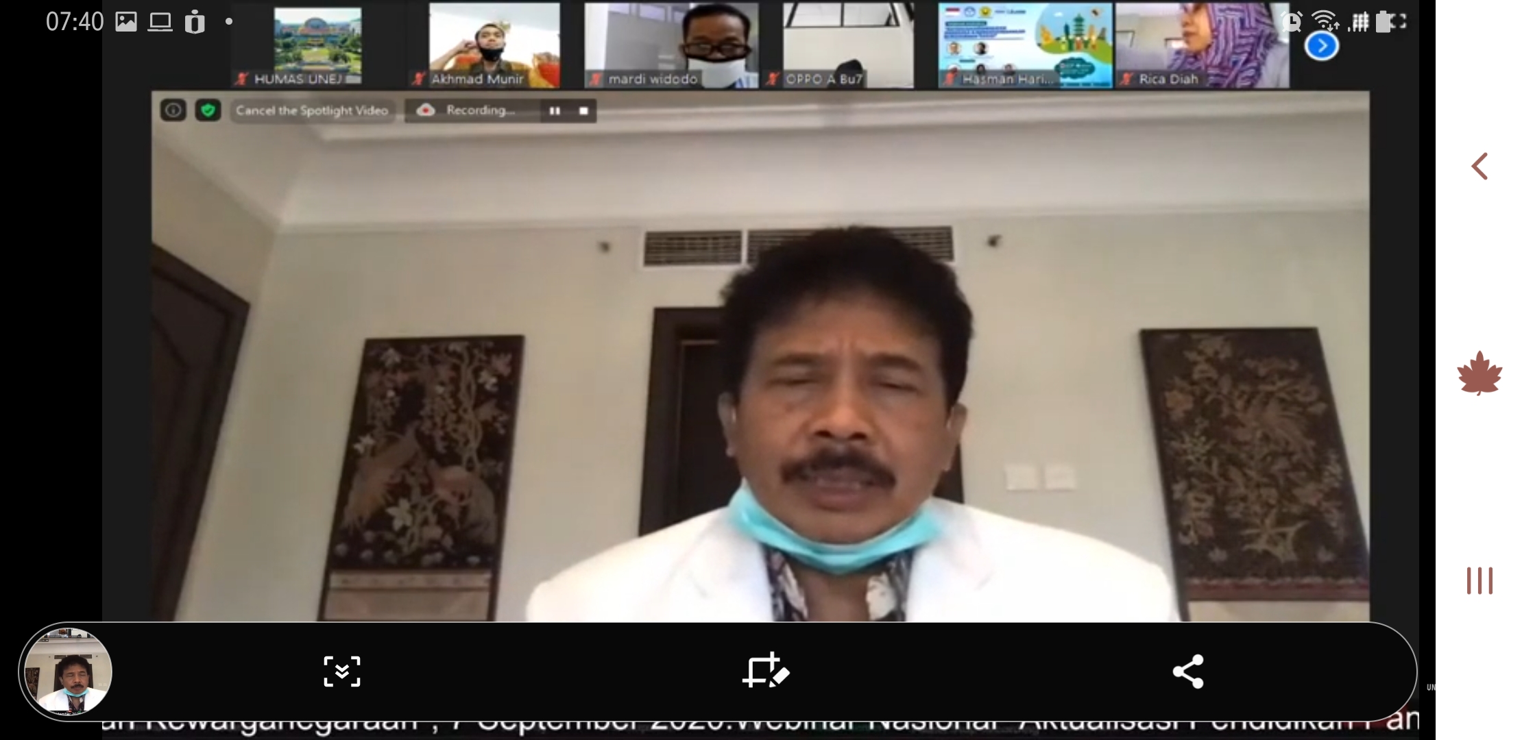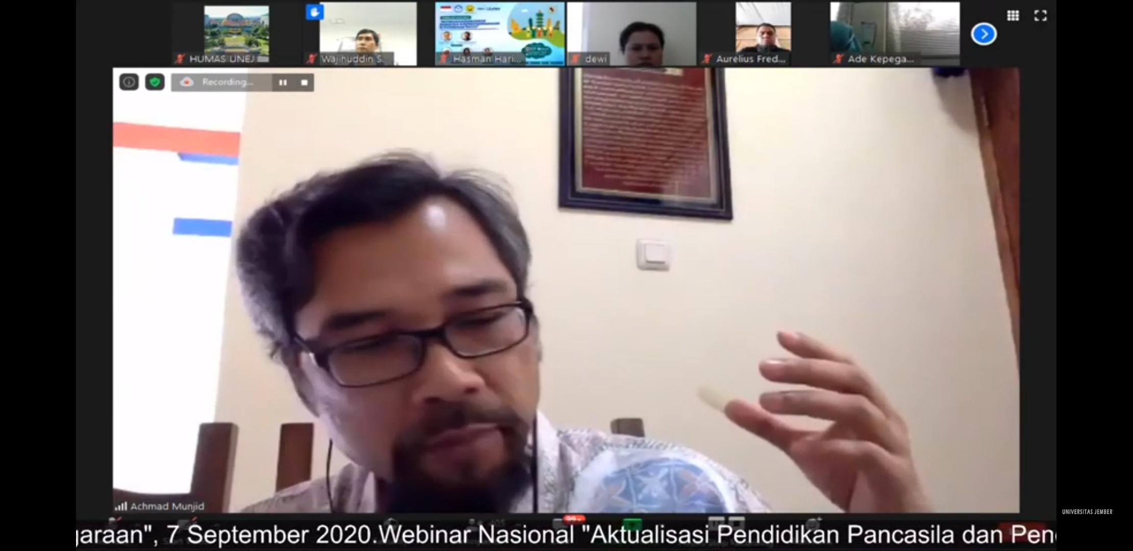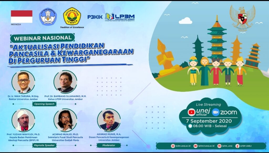 Dalam rangka peningkatan kualitas pembelajaran di lingkungan Universitas Jember, pada hari Senin, 7 September 2020 Pusat Pengembangan Pendidikan Karakter dan Ideologi Kebangsaan (P3KIK) Lembaga Pengembangan Pembelajaran dan Penjaminan Mutu (LP3M) Universitas Jember melaksanakan kegiatan melalui Teleconference via Zoom dengan pembicara Prof. Drs. KH. Yudian Wahyudi, MA., Ph.D (Kepala Badan Pembinaan Ideologi Pancasila RI) dan Achmad Mundjid, SS., MA.